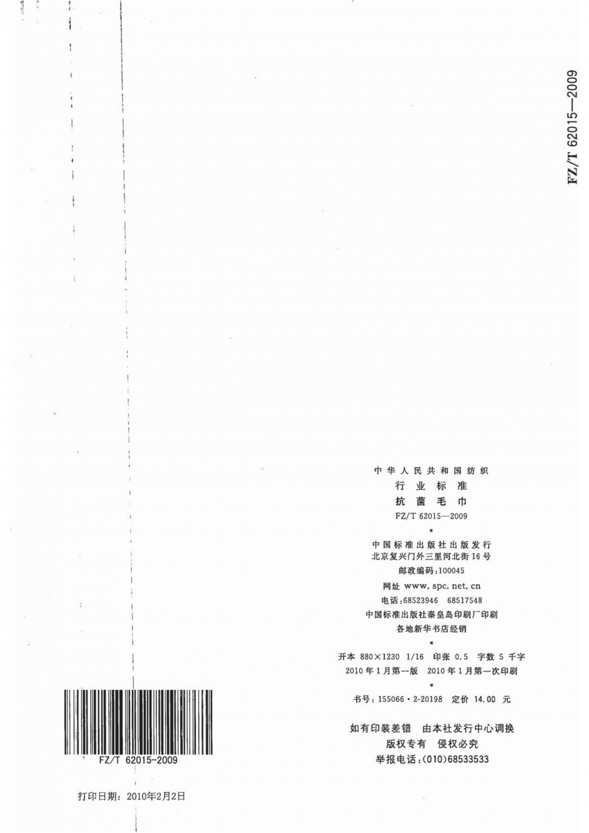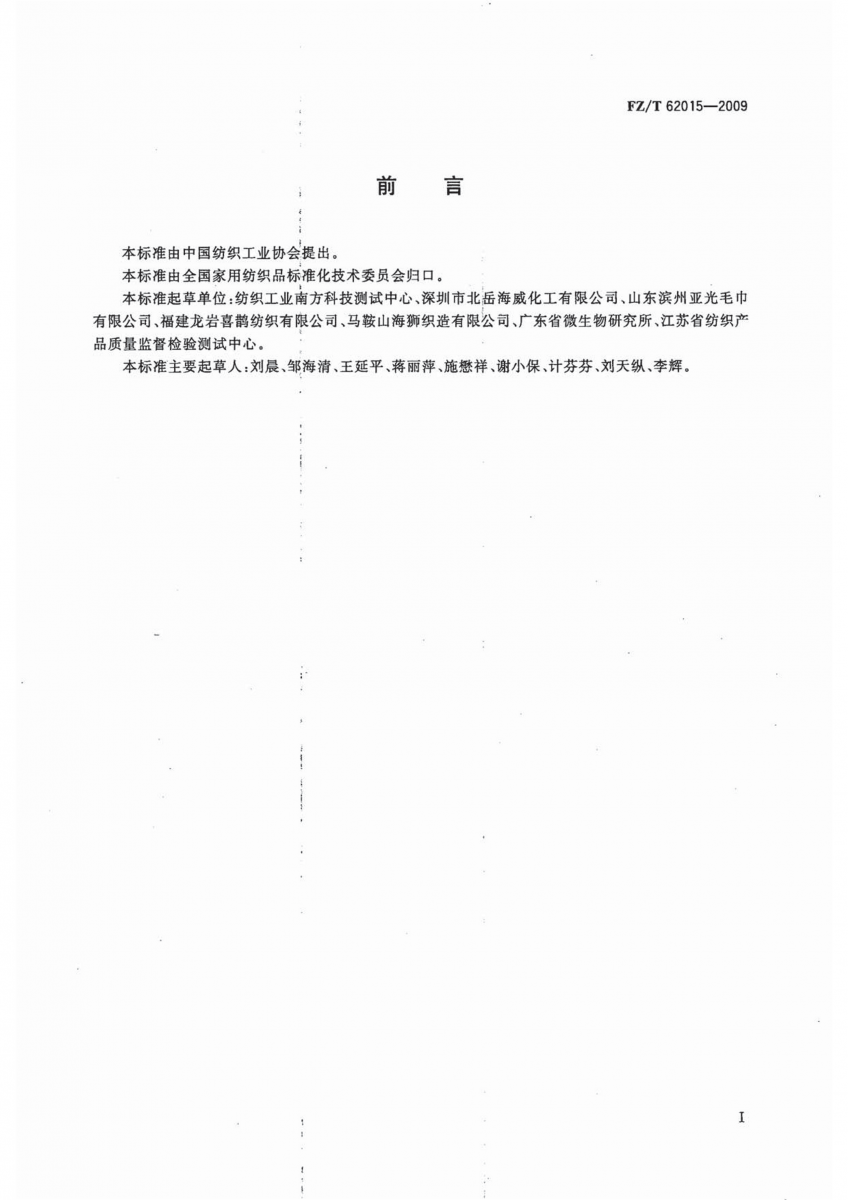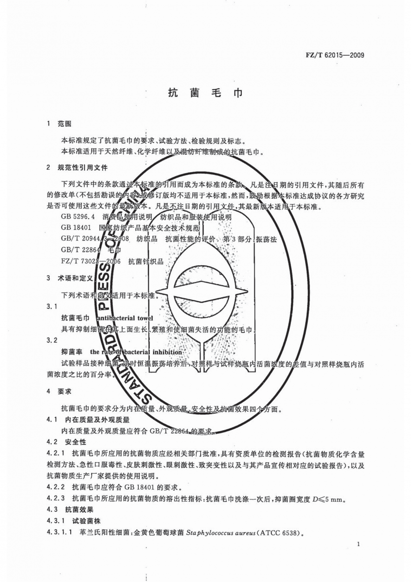 FZ/T 62015-2009 抗菌毛巾