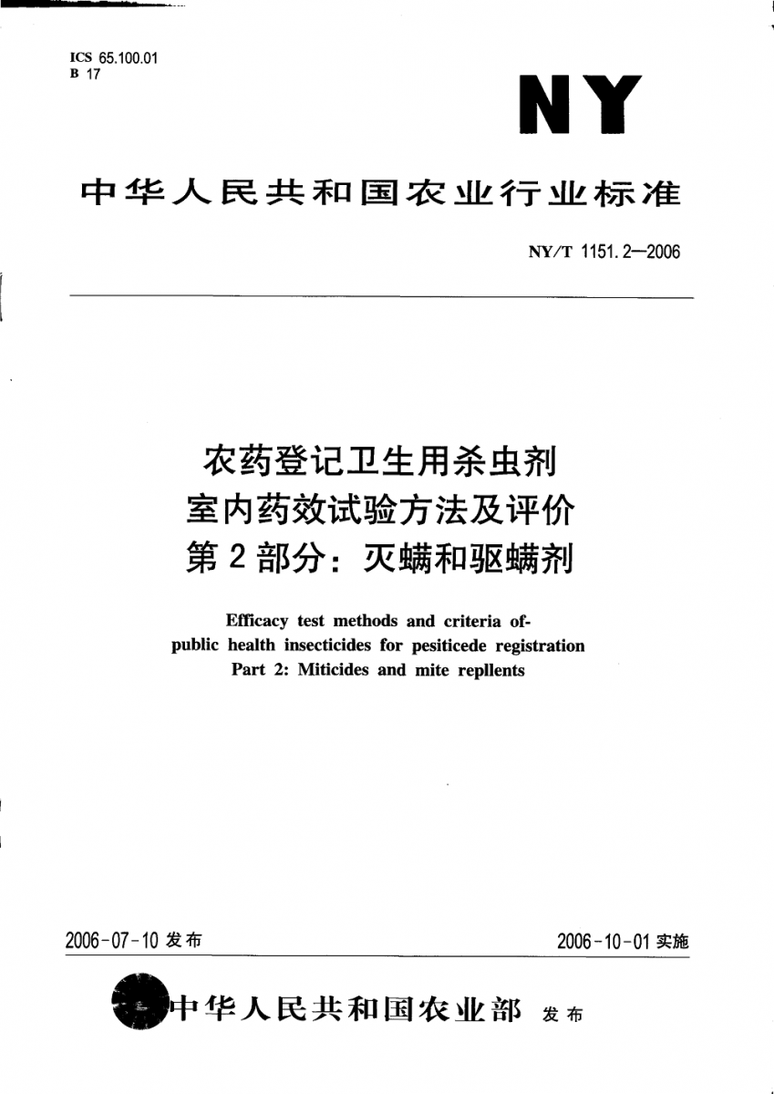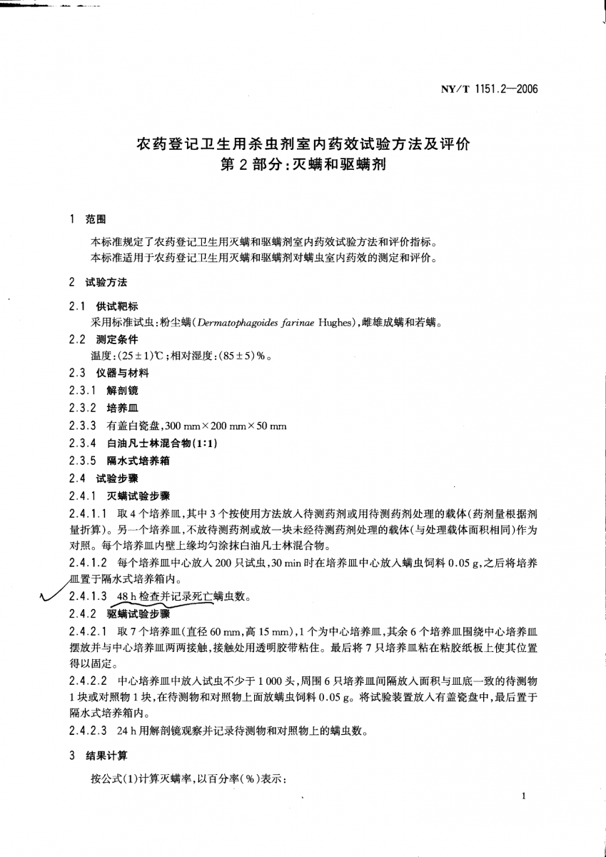 NY/T 1151.2-2006 滅螨和驅螨:室內藥效試驗方法及評價