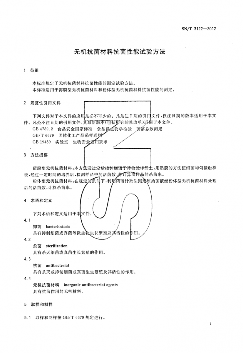 SN/T 3122-2012 無級抗菌材料抗菌性能試驗方法