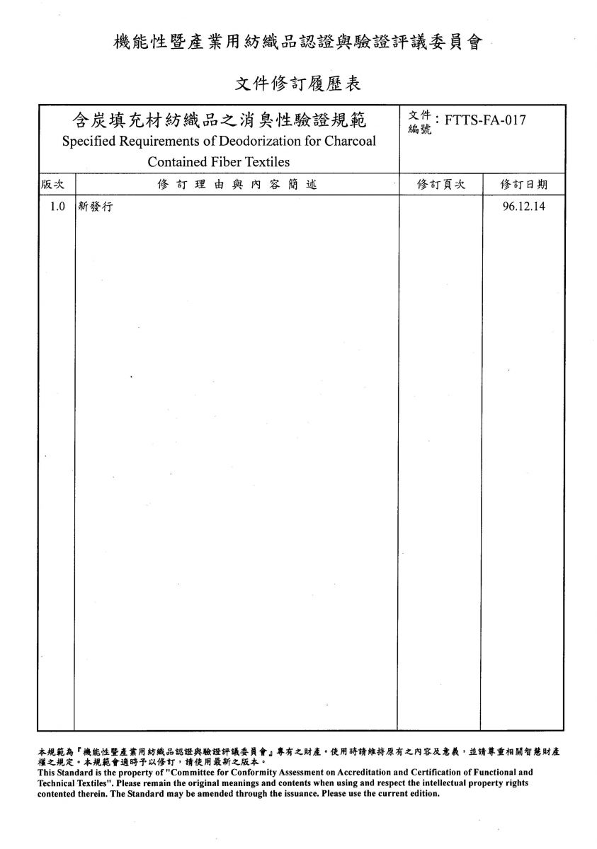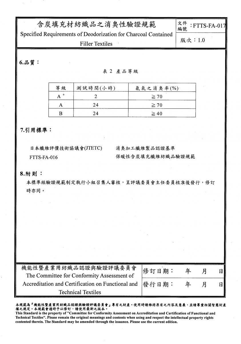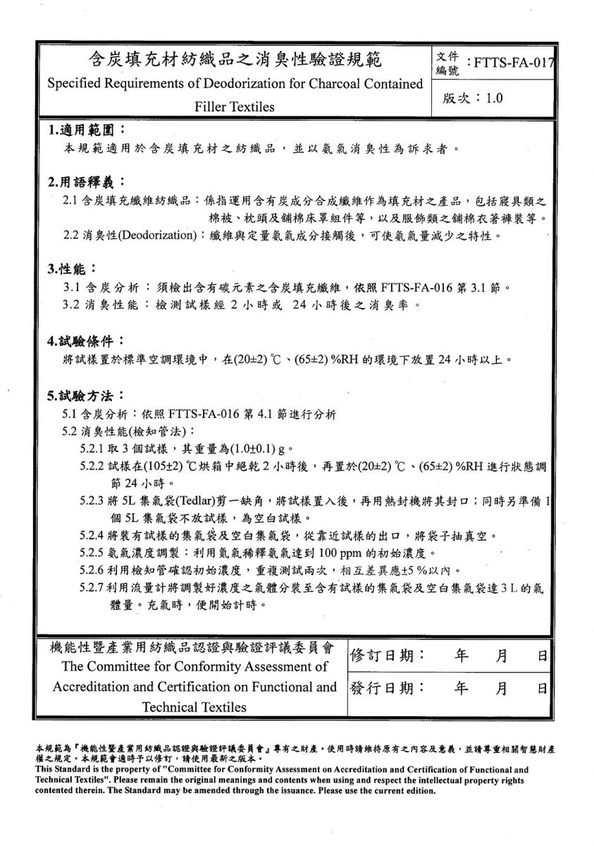 FTTS-FA-017(TW)含炭填充材紡織品之消臭性驗證規範