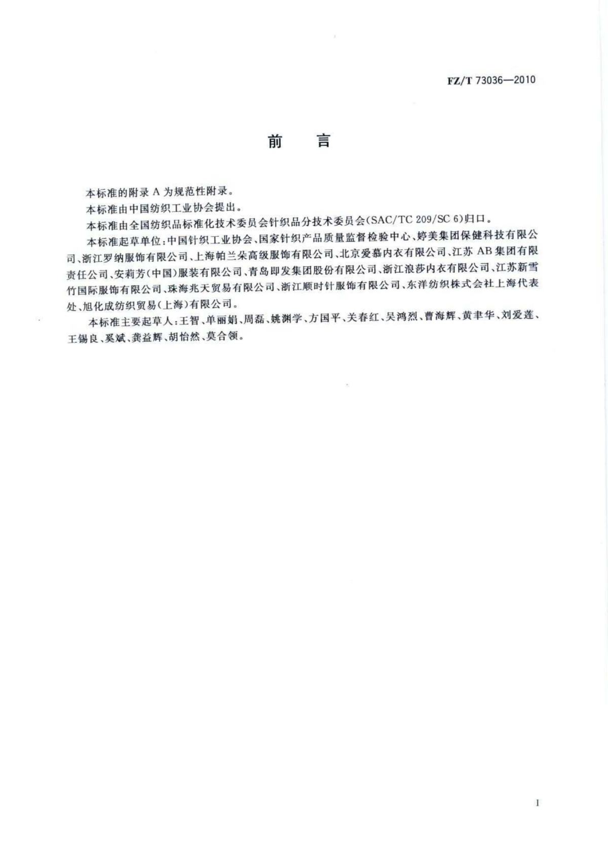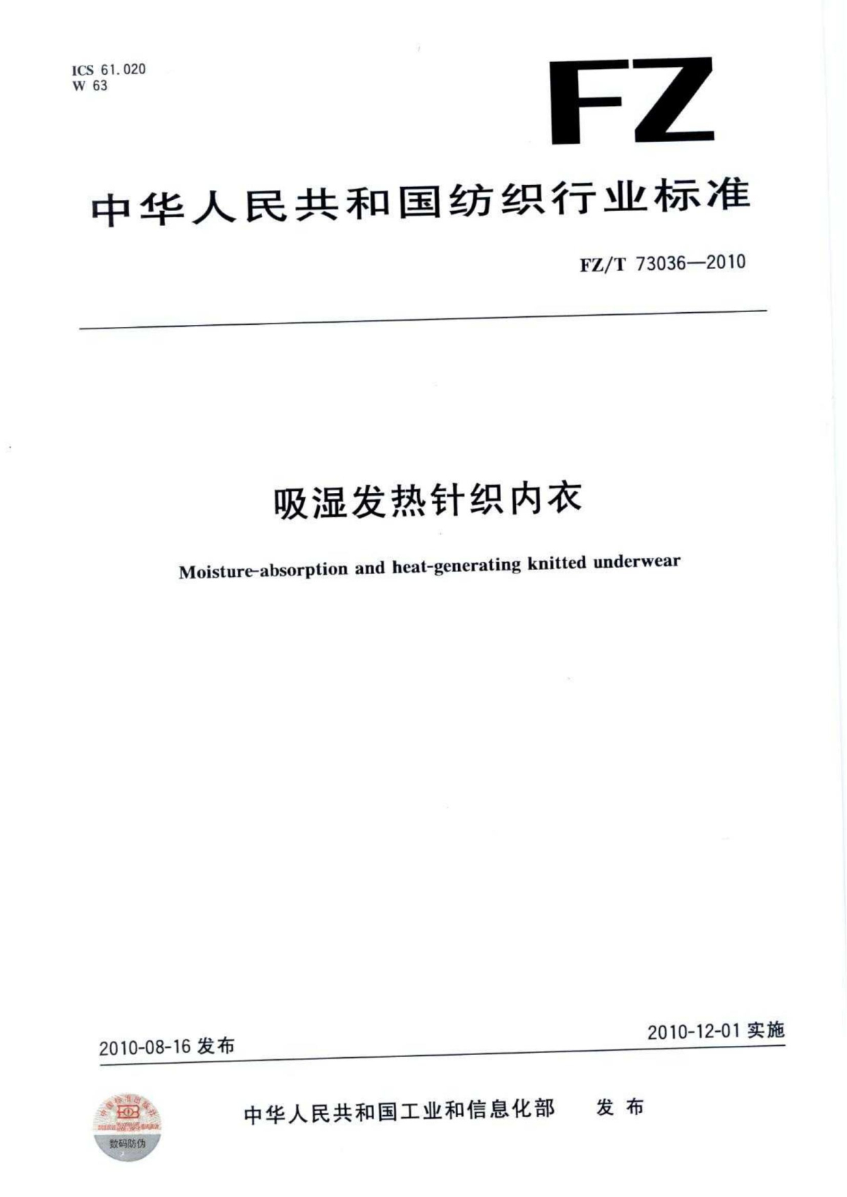 FZ/T 73036-2010 Moisture-absorption and heat-generating knitted underwear