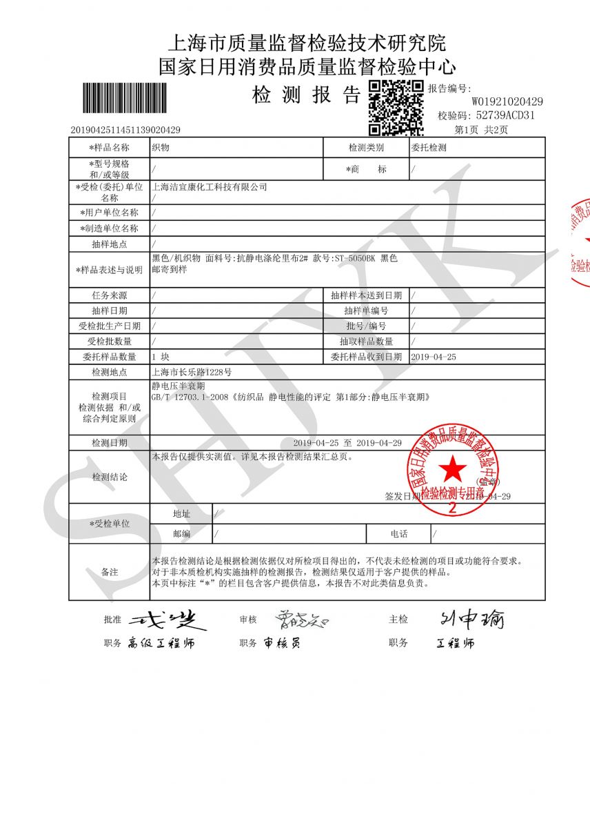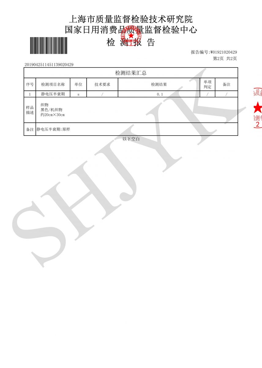 靜電壓半衰期-2#黑色滌綸機織物--上海市質檢中心