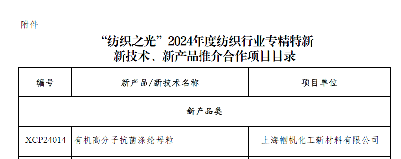 Recently, the China Textile Industry Federation authority issued the "Textile Light" 2024 Technical innovation and product optimization Guide ", The project "organic polymer antibacterial polyester masterbatch" of Shanghai Guofan Chemical New-Material successfully selected the "Textile Light" 2024 SRDI New Technology, New Product Promotion Cooperation Project". Shanghai Guofan become an important member of the cooperation project this year.