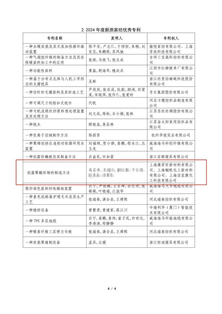In order to stimulate the innovation vitality of the industry, tap the innovation potential of the industry, and encourage the units and individuals who contribute to the innovation of the industry, the China Home Textile Industry Association has successively carried out the collection of outstanding patents in the China home textile industry in 2024, excellent papers in the China Home textile science and technology innovation, and excellent cases in the China home textile science and technology innovation. After the selection, Shanghai Healthy-Silk New- Material Co., LTD., Shanghai Guofan Chemical New- Material Co., LTD., and Shanghai Jiecon Chemicals Hi- Tech Co., LTD., with their in-depth work and technological innovation in the field of material science, won the "2024 China Home Textile Industry Association New Quality Home textile Excellent Patent" award.