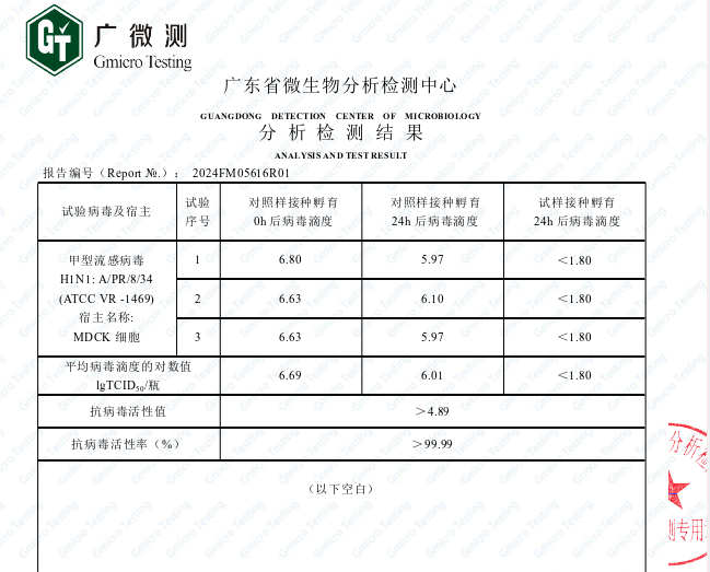 It can be seen from the above test data that under visible light conditions, the photocatalyst finishing agent has good antiviral performance against the representative viruses including the enveloped viruses and non-enveloped viruses. This shows that the photocatalytic finishing agent developed by our company has a good antiviral activity rate against viruses under visible light conditions.