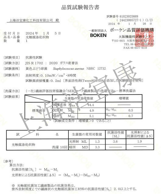 According to JIS R 1702:2020 ガラス close adhesion method (under ultraviolet), the antibacterial activity value of Staphylococcus aureus in the test sample was 3.6, and the antibacterial activity value of photocontribution was 1.9. The antibacterial activity of Bacillus pneumoniae was 3.6, and the antibacterial activity of photocontribution was 1.0. The test results show that the fabric treated with the photocatalytic finishing agent developed by our company has obvious photocatalytic activity, can produce good antibacterial action, and has good washing resistance.