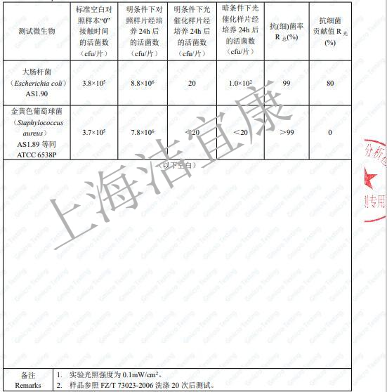According to the Chinese national standard GB/T 23763-2009 "Evaluation of antibacterial properties of photocatalytic antibacterial materials and products", the antibacterial rate of Staphylococcus aureus was greater than 99% ,and Escherichia coli in the test samples was  99% (ultraviolet light contribution value 80%). The test shows that it has more obvious antibacterial properties and good washing resistance under ultraviolet conditions.