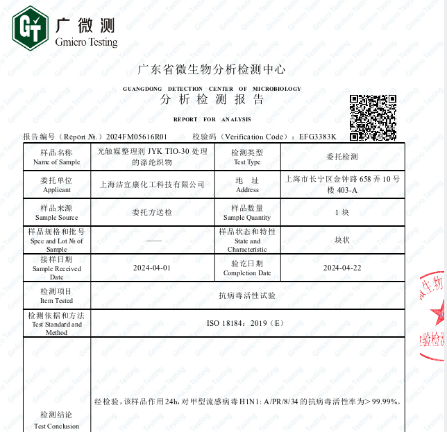 The antiviral activity rate of the photocatalyst treated fabric against influenza virus H1N1 (envelope virus) was >99.99%, and it had excellent antiviral performance.