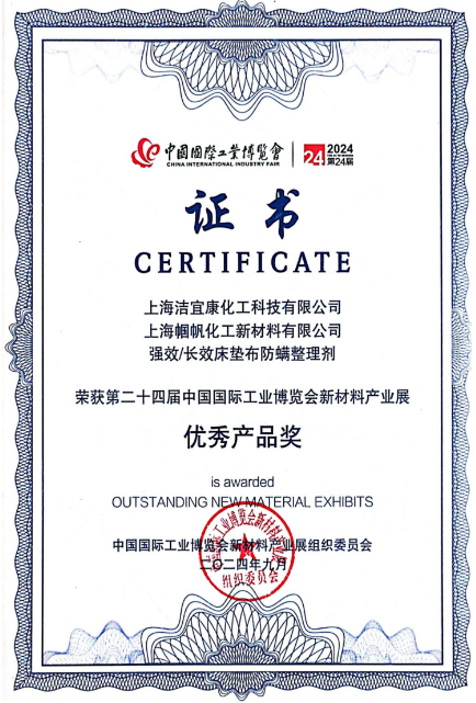 As a rising star and pioneer in the subsector of functional textile new materials, Shanghai Jiecon has achieved sustained growth against the trend in a difficult environment, thanks to the wisdom and hard work of all employees, especially the company's soul - founder and general manager Dr. Ma Zhengsheng, who relies on profound knowledge accumulation, superb technology and the courage to open up the spirit of innovation. Overcome a number of technical problems, continue to develop a number of novel functions, superior performance, widely praised new products, and obtained dozens of invention patents and utility model patents. Among them, there are many products such as "efficient antibacterial and antiviral finishing agent" and "strong/long-term anti-mite finishing agent for mattress cloth" that have won the excellent product award of the New Materials Exhibition of the Fair, and the patented technology that has won the excellent patent of the new quality home textile in 2024 by the China Home Textile Industry Association.