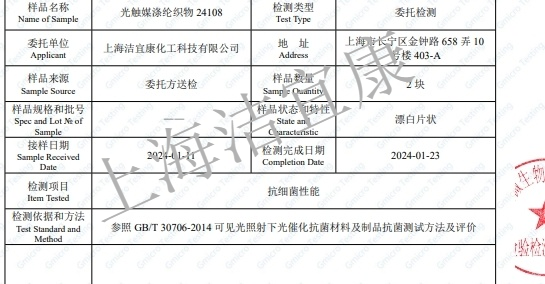 According to the Chinese national standard GB/T 30706-2014 "Antibacterial test methods and Evaluation of Photocatalytic Antibacterial Materials and Products under Visible Light Irradiation", the antibacterial rate of Staphylococcus aureus and Escherichia coli in the test samples was 99%, and the light contribution rate was 67%. The test shows that the fabric treated with the photocatalyst finishing agent developed by our company has good antibacterial properties and good washing resistance under visible light conditions.