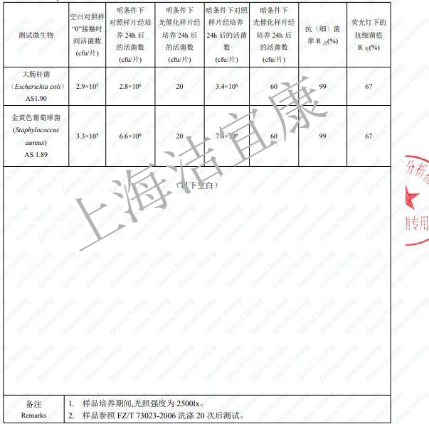 According to the Chinese national standard -GB/T 23763-2009 "Evaluation of Antibacterial Properties of photocatalytic antibacterial Materials and products", the antibacterial rate of Staphylococcus aureus and Escherichia coli in the test samples was greater than 99% and 99% (UV contribution value 80%). The test shows that it has more obvious antibacterial properties and good washing resistance under ultraviolet conditions.