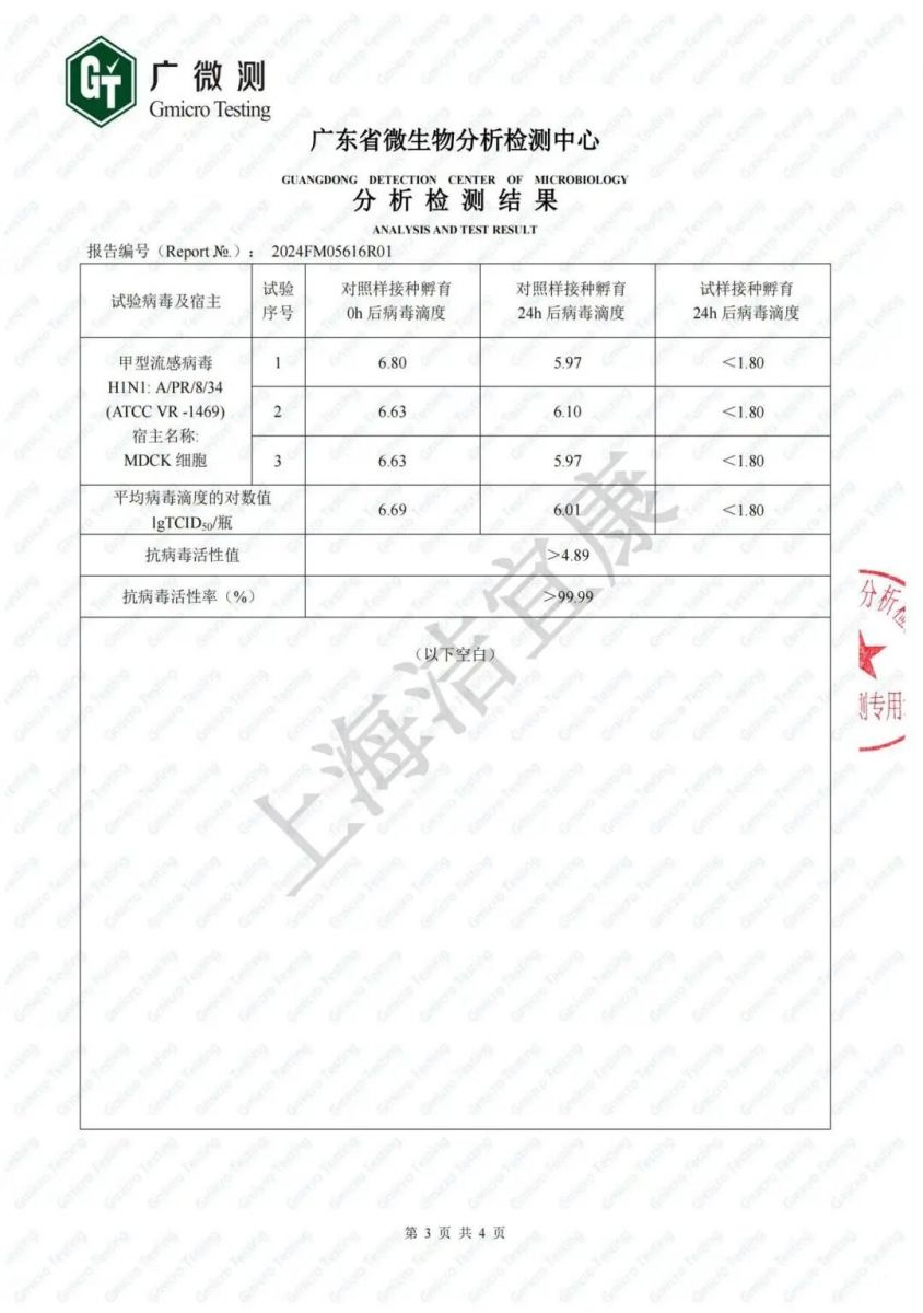 According to ISO 18184:2019 "Textiles - Determination of Antiviral Activity of Textiles", the antiviral activity rate of the test sample against Influenza A virus H1N1 is greater than 99%. The test shows that under ultraviolet conditions, it has more obvious antiviral performance and good washing resistance.