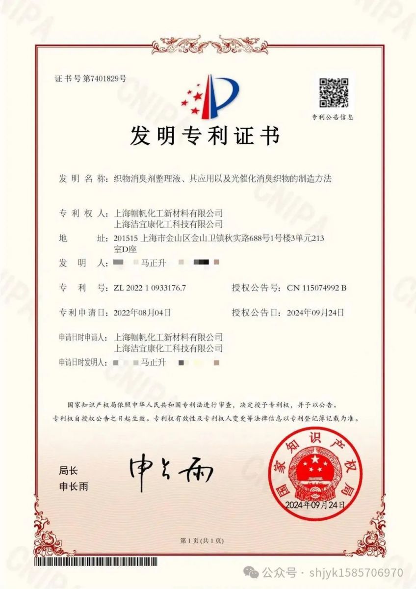 Relying on the profound technical accumulation from years of in-depth engagement in the industry and adhering to the pioneering and innovative spirit, Shanghai Jiecon Chemicals Hi- Tech Co., Ltd. independently developed the invention patents of "Fabric Deodorizing Agent Finishing Liquid, Its Application and Manufacturing Method of Photocatalytic Deodorizing Fabric" and "Photodeodorizing Catalyst, Its Preparation Method and Its Application", which are exemplary achievements of the deep integration of technological innovation and industrial practice.