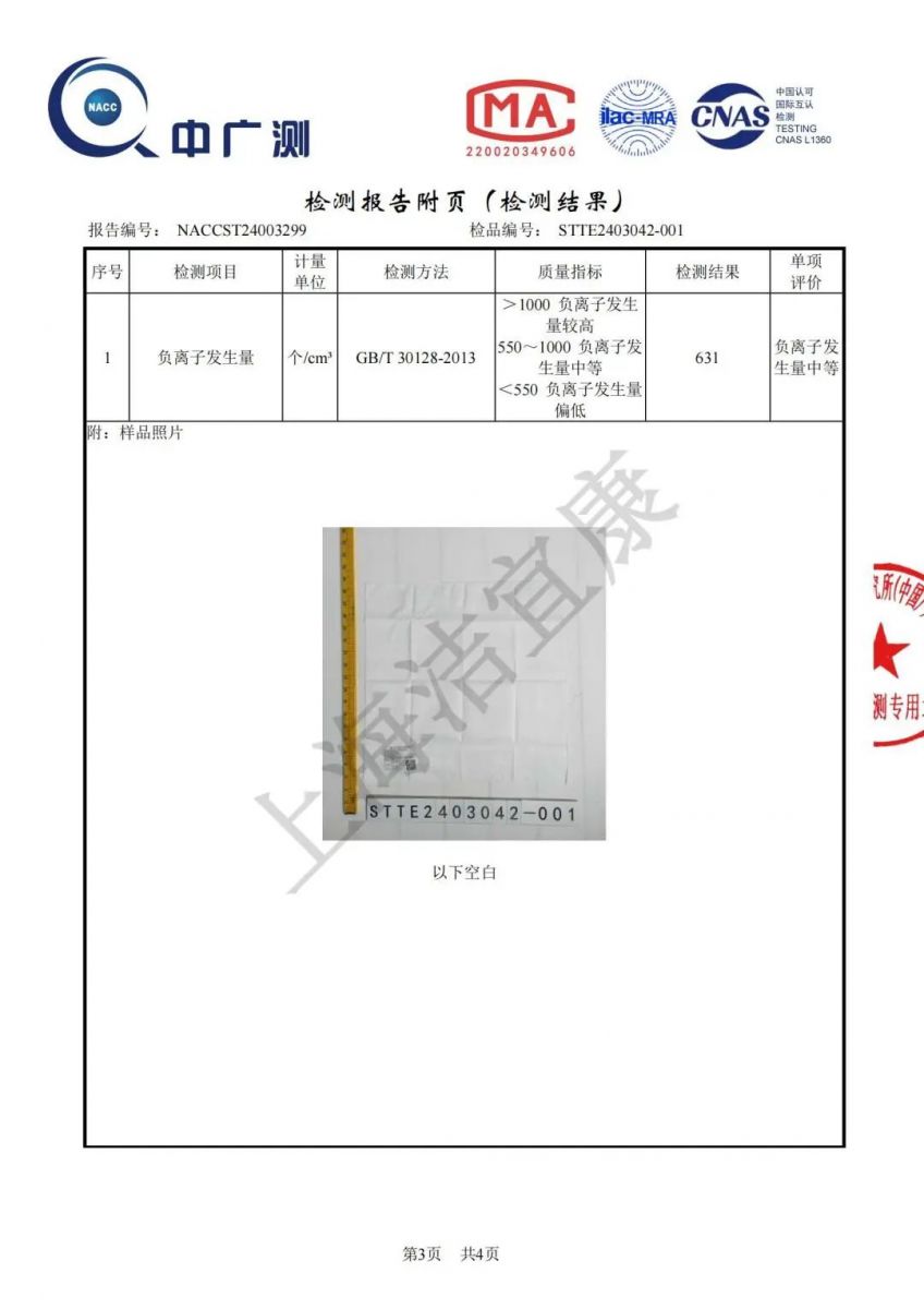 According to the Chinese national standard GB/T 30128-2013 "Textiles - Detection and Evaluation of Negative Ion Generation", the negative oxygen ion generation of the test sample reached 631. The test shows that under ultraviolet conditions, it has obvious negative oxygen ion generation performance and good washing resistance.