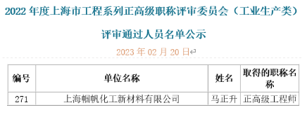 2022年度上海市正高級エンジニアの審査作業の通知に基づき、當社総経理の馬正升博士/高級技師は上海市正高級技師職の申告を行いました。